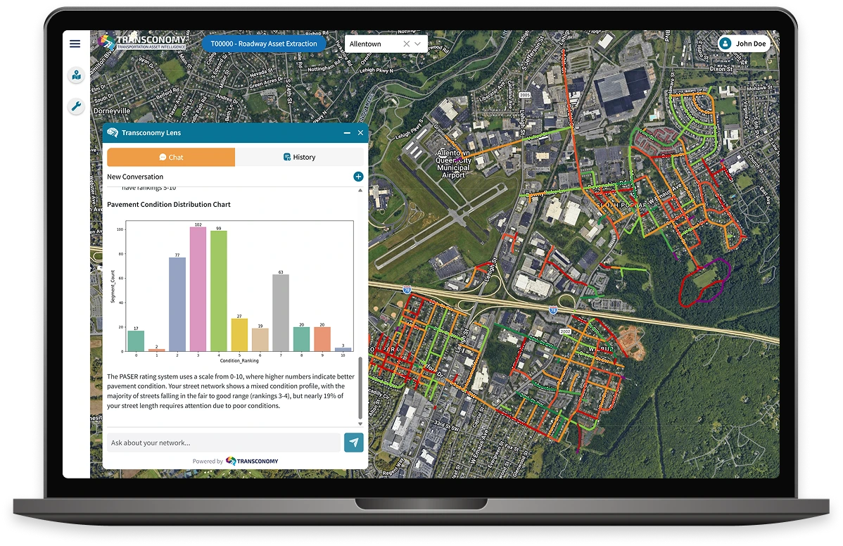Transconomy Roadmap is designed to support every phase of the transportation pavement and asset management lifecycle from planning and data collection to advanced analytics and reporting. Built on a robust Geographic Information System (GIS) interface, the platform gives transportation agencies a powerful foundation for managing their entire infrastructure network with efficiency, accuracy, and transparency. At its core is a rich dataset of geospatial transportation asset data covering roads, signs, markings, intersections, and more capturing condition, location, and maintenance history across an agency’s full network. While this data is incredibly valuable, extracting meaningful insights has traditionally required GIS expertise or technical skills that not every decision-maker possesses. Transconomy Lens bridges that gap by adding a conversational AI interface directly into the Roadmap platform, allowing any user to ask questions in plain English.